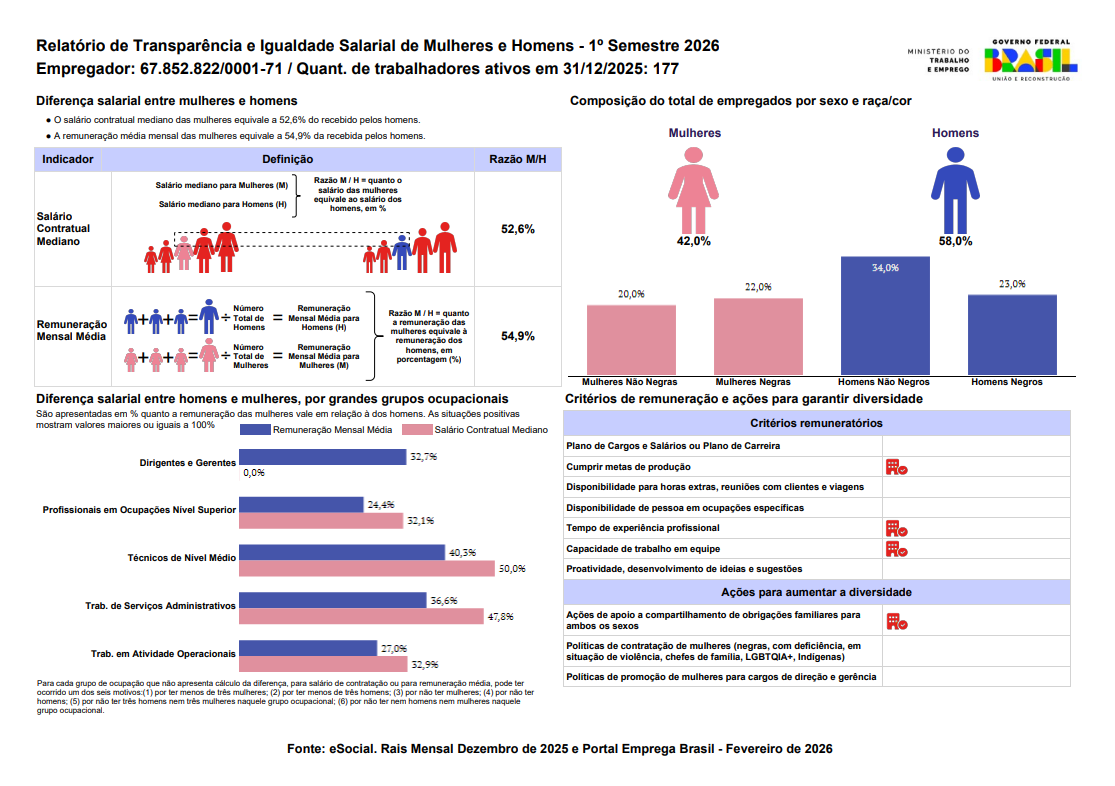 Em atendimento à Lei nº 14.611 de 03 de julho de 2023 e à regulamentação em vigor, a Viskase divulga abaixo o Relatório de Transparência e Igualdade Salarial de Mulheres e Homens – 1º Semestre 2026, elaborado pelo MTE – Ministério do Trabalho e Emprego e obtido pela Viskase no website do MTE em 03/2026.
